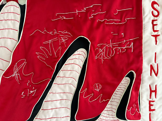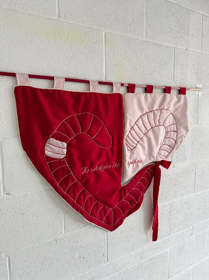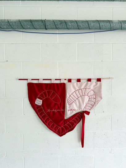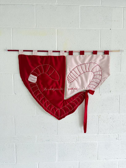 Silk Satin, cotton, Satin ribbon, embroidery thread, pine dowel, acryllic paint.